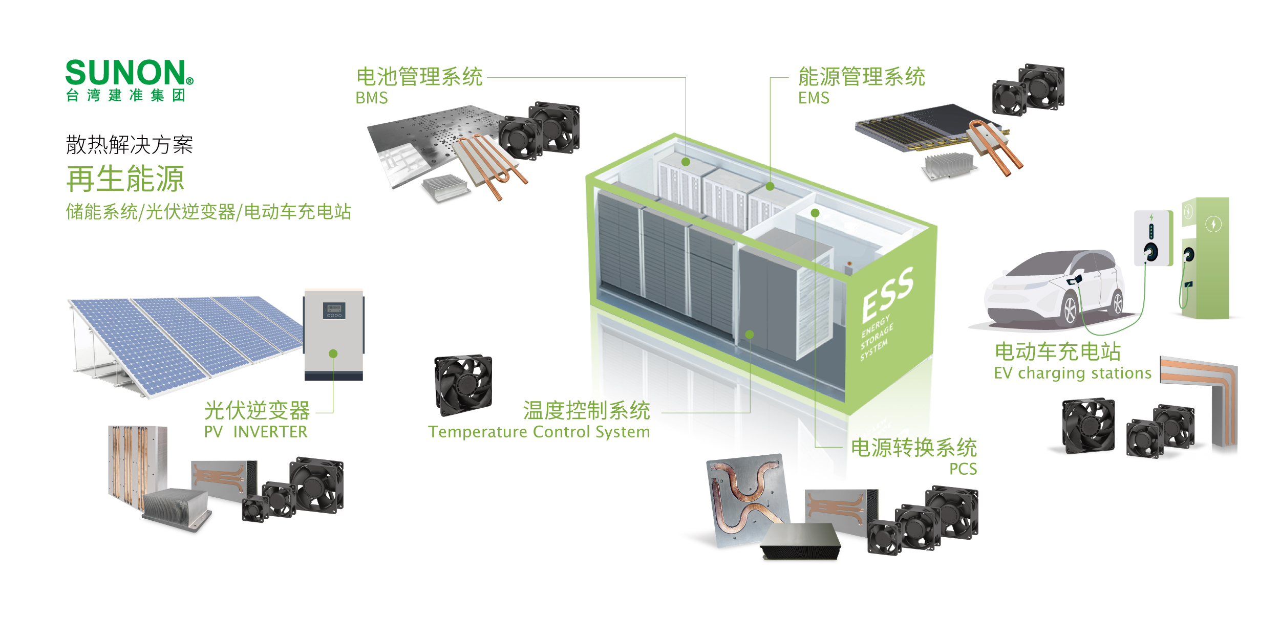 SUNON 提供完整的散熱風(fēng)扇與散熱模組產(chǎn)品。高防護(hù)系列GF/PF 風(fēng)扇提供高效能散熱與兼具防塵防水IP68 最高等級(jí)與GR487耐鹽霧等防護(hù)功能;客制化水冷模組及完整的技術(shù)評(píng)估服務(wù),快速提供客戶最適化散熱解決方案,滿足惡劣環(huán)境下運(yùn)作的EV充電系統(tǒng)、ESS 儲(chǔ)能系統(tǒng)、太陽(yáng)能PV逆變器等再生能源系統(tǒng)使用。